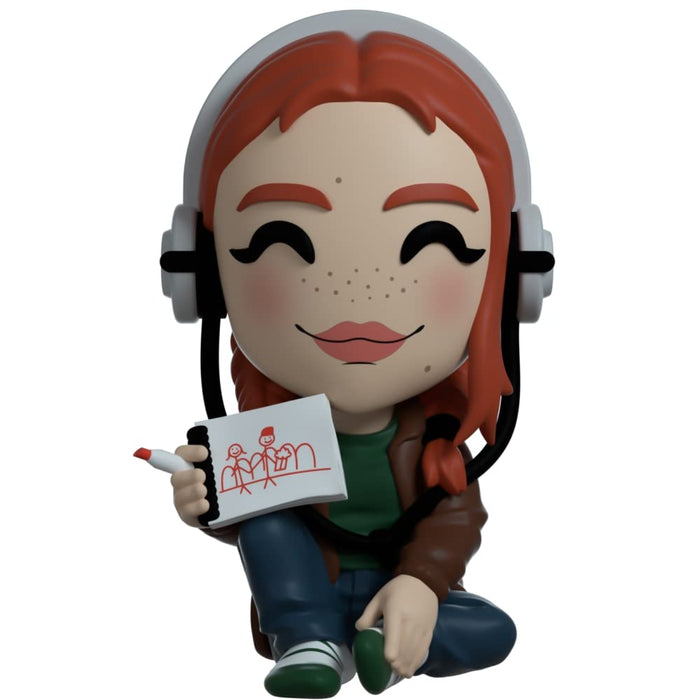 • Movie Friday? Introducing Max Mayfield in the Youtooz x Stranger Things collaboration! Max poses sitting on the floor, his legs bent at his knees, his right pointing up and his left facing the sides. She wears red hair collected in two braids with some loose strands around her face. He has a slight blush on his face and freckles are seen as he outlines a kind smile. She is dressed in a brown jacket and blue jeans with a green shirt matching green and white socks.