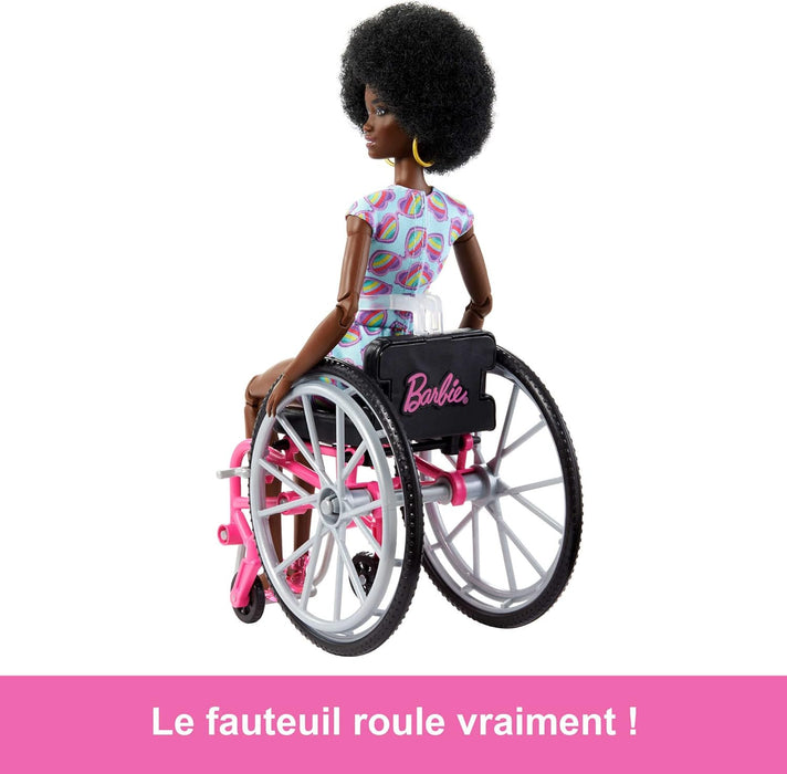Barbie Doll with Wheelchair and Ramp, Kids Toys, Barbie Fashionistas, Curly Black Hair, Rainbow Heart Romper, Clothes and Accessories, HJT14
