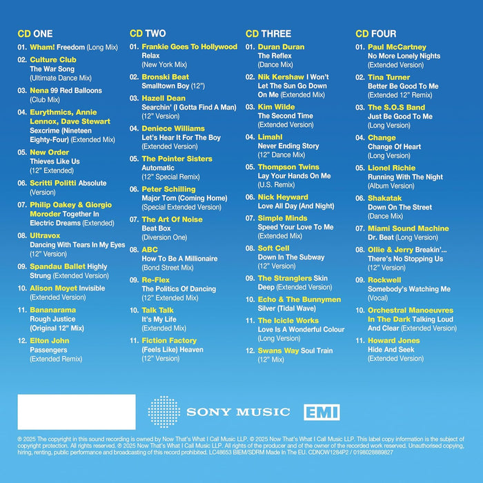 NOW Music proudly presents the next instalment in the 'NOW 12'' 80s' series - 'NOW 12'' 80s: 1984 - Part Two', out 11th April 2025. With 46 extended, full-length and remixed versions, this collection captures the energy and diversity of 1984 - a defining year for pop, alternative, electronic and dance music - featuring global chart-toppers, cult classics, and unforgettable club anthems in their 12' versions. This essential set, together with Part One released back in January, is a must-have for collectors and fans of great pop music alike - taking a journey back to the excitement of 1984's amazing line-up. CD1 opens with the long mix of Wham!'s 'Freedom' opening a stellar run of huge chart hits. Culture Club's 'The War Song', is followed by Nena's worldwide #1, '99 Red Balloons', followed by Eurythmics, New Order and Scritti Politti. Philip Oakey & Giorgio Moroder's classic 'Together in Electric Dreams' in its extended mix, along with the 12-inch version of 'Dancing With Tears in My Eyes' from Ultravox are enduring synth-pop classics - and rounding off the disc '84 Pop gold from Spandau Ballet, Alison Moyet, Bananarama and Elton John. Frankie Goes To Hollywood's '5-weeks at #1' smash 'Relax' needs little introduction, and kicks off CD2 with its 'New York Mix'. Bronski Beat's powerful and poignant 'Smalltown Boy' is up next along with celebratory Hi-NRG and electro from Hazell Dean, Deniece Williams' 'Let's Hear It for the Boy', and the 12-inch remix of The Pointer Sisters' 'Automatic'. A run of synth-driven gems from Peter Schilling, The Art of Noise, ABC, Re-Flex, Talk Talk and Fiction Factory complete the disc in true '84 style. CD3 is packed with pure pop brilliance, opening with Duran Duran's worldwide #1 hit 'The Reflex' in its iconic Dance Mix. Nik Kershaw scored a huge hit with 'I Won't Let the Sun Go Down On Me', Kim Wilde's hits continued with 'The Second Time' and Limahl's 'Never Ending Story' was one of the most memorable film themes of the decade, here in its 12-inch Dance Mix. Simple Minds and Soft Cell lead into classic alt-pop tracks from The Stranglers ('Skin Deep'), Echo & The Bunnymen ('Silver'), The Icicle Works with the long version of 'Love Is a Wonderful Colour', and Swans Way with the 12-inch mix of the stunning 'Soul Train'. CD4 opens with legends, Paul McCartney with the extended version of 'No More Lonely Nights', and Tina Turner with 'Better Be Good to Me'. Some of '84's biggest floor-fillers including 'Just Be Good to Me' from The S.O.S Band, and 'Running With the Night' from Lionel Richie are featured along with jazz, latin and electro infused dance pop from Shakatak, Miami Sound Machine and Ollie & Jerry respectively. Rockwell's timeless 'Somebody's Watching Me' leads into two synth ballads to close the collection in their extended versions: 'Talking Loud and Clear' from Orchestral Manoeuvres In The Dark, and the beautiful 'Hide and Seek' from Howard Jones. 'NOW 12'' 80s: 1984 - Part Two' captures more 12-inch moments from a truly gigantic year in pop music history. It celebrates the hits that filled dancefloors and dominated charts across the globe, completing our celebration of the format in 1984.