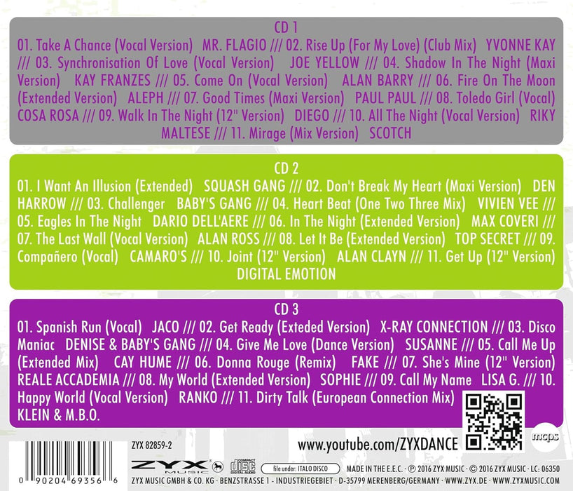 ZYX Italo Disco Collection 21 33 Italo Disco classics of the 80s on 3 CDs! The 21st edition of the cult series offers the perfect mix between hits and rarities. This time with Mr. Flagio Take A Chance // Alan Barry Come On // Diego Walk In The Night // Klein & M.B.O. Dirty Talk // Baby s Gang / Joe Yellow / Aleph / Den Harrow / Max Coveri / Alan Ross / Jaco / X-Ray and mny more.
