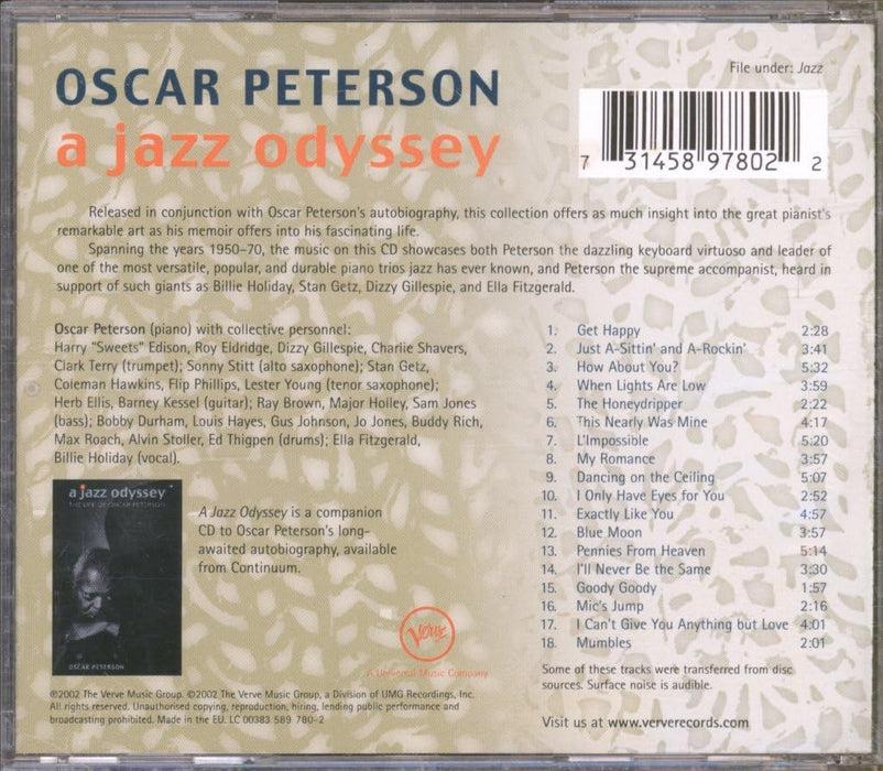 A Jazz Odyssey is both a book and a CD from Oscar Peterson, although Richard Palmer edited the book and chose this CD reissue compilation. On both counts he can say to have excelled himself, for the book is absorbingly concise and this CD is a healthy and balanced cross section of Peterson's main musical activities and proclivities.