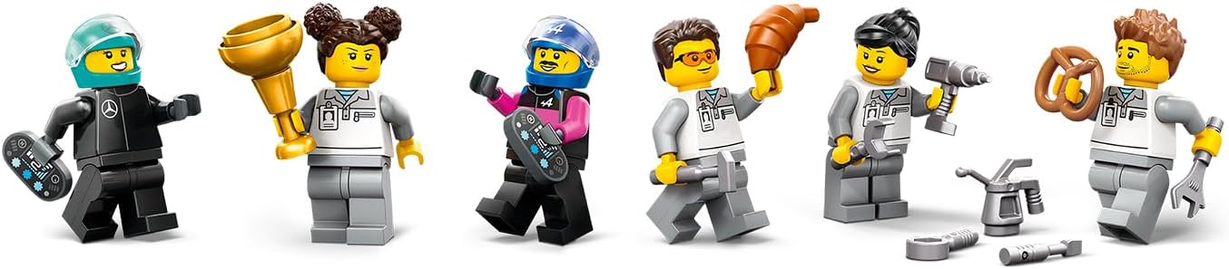 • Wat zit er in de doos? – inclusief een garage voor speelgoed auto's met werkbanken, gereedschaps- en laskarren, een stapel gladde banden en 2 F1 raceauto's, plus een trofee voor de winnaar en minifiguren van 2 coureurs en 4 monteurs