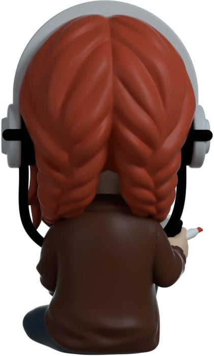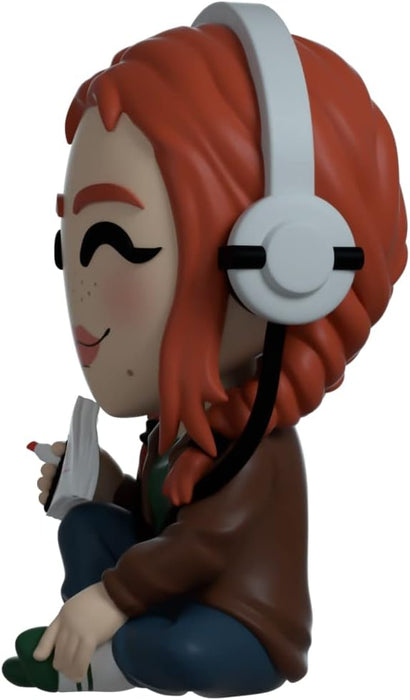 • Movie Friday? Introducing Max Mayfield in the Youtooz x Stranger Things collaboration! Max poses sitting on the floor, his legs bent at his knees, his right pointing up and his left facing the sides. She wears red hair collected in two braids with some loose strands around her face. He has a slight blush on his face and freckles are seen as he outlines a kind smile. She is dressed in a brown jacket and blue jeans with a green shirt matching green and white socks.