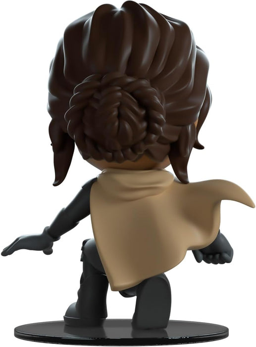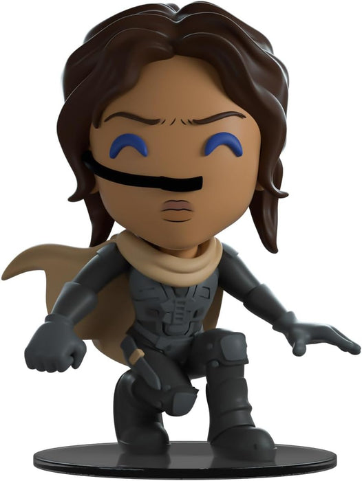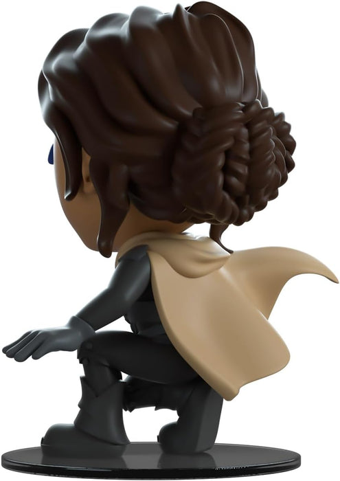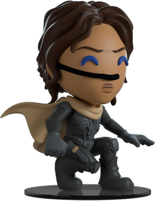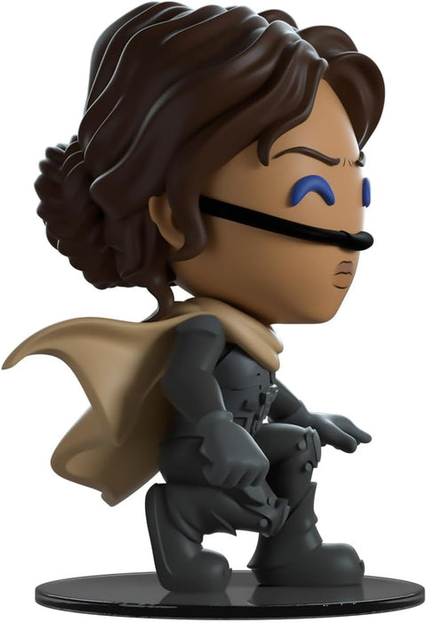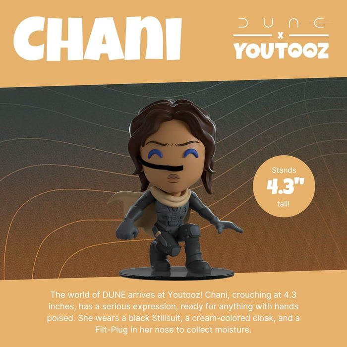 • Youtooz Dune Chani Vinyl Figure: Crouching at 4.3 inches, Chani has a serious look on her face with her eyebrows furrowed and her lips forming a straight line. She is posed in a way that shows she's cautious of her surroundings, with both her hands floating around her so she is ready for anything that may happen. She is dressed in a black Stillsuit with a dark cream colored cloak that is swaying in the wind.