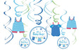 Decorate your space with this With Love Baby Boy Swirl Decorations. It features blue chevron and polka dot patterns and the words "It's a Baby Boy!" printed with a clothesline of baby boy clothes in the center.