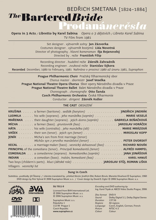Gabriela Benackova, Peter Dvorsky, Richard Novak, and Miroslav Kopp star in the 1981 TV production of the Smetana opera with the Prague Philharmonic Chorus and Czech Philharmonic conducted by Zdenek Kosler.