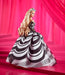 - She wears a black and white gown inspired by the swimsuit that the original Barbie doll wore. A fitted sweetheart bodice blooms into a voluminous striped skirt.