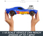Get behind the wheel of a Hot Wheels legend with the 1:16 scale remote control Rodger Dodger. This highly detailed vehicle features authentic graphics and has full-function RC capability. Its 2.4 GHz frequency prevents interference when racing other RC cars -- reach speeds up to 7 MPH in head-to-head challenges. (Additional cars sold separately.) Recharge with a USB cable for 90 minutes of play per charge; the remote requires two AAA batteries. Batteries sold separately. Colors and decorations may vary.