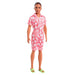 - This Ken doll wears a white and coral Hawaiian print jumpsuit that really makes his personality pop!