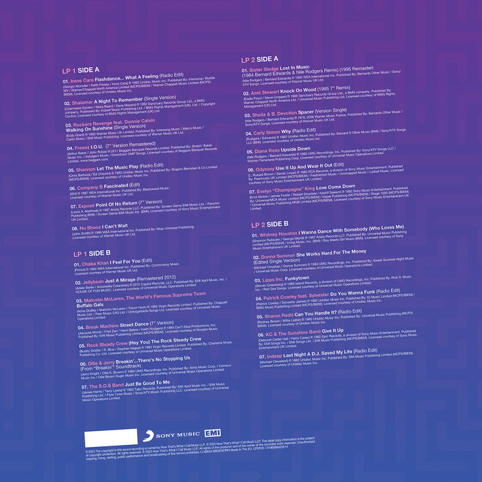 NOW Music is proud to present the second in our ongoing series of vinyl compilations, 'NOW That's What I Call 80s Dancefloor'. Each edition features an essential collection of tracks representing key genres from the incredible diversity that were all part of 1980s Dance music. This volume, featuring 29 tracks across 2 LPs, presents the best in Disco and Electro. Following the height of its popularity in the late 1970s, Disco in the early 1980s retained the irresistible melodies and beat but became primarily synth driven. The era saw some of the genres' biggest hits including this collections' opener 'Flashdance.What A Feeling' from Irene Cara - this theme from the film 'Flashdance' was not only a massive selling single, but the song also won multiple awards including an Academy Award. Lipps Inc. produced a timeless hit with 'Funkytown', and Shalamar with 'A Night To Remember', Odyssey with 'Use It Up And Wear It Out' and Indeep's 'Last Night A DJ Saved My Life' were all huge commercial Disco hits. Disco royalty Nile Rodgers and Bernard Edwards of Chic feature here in their roles as producers and writers with Diana Ross's massive hit 'Upside Down', 'Why' from Carly Simon, and the peerless 'Spacer' from Sheila & B. Devotion and in 1984 remixed Sister Sledge's 'Lost In Music' which became a massive hit again and is included here in its full 12-inch version. Amii Stewart's classic version of 'Knock On Wood' was remixed and a hit again, Donna Summer enjoyed huge success with 'She Works Hard For The Money', and other established Disco superstars celebrated returns to the charts with an '80s Disco sound including, and featured on this collection, KC & The Sunshine Band, Patrick Cowley feat. Sylvester and Evelyn 'Champagne' King. The prevalence of the synth in the 1980s gave rise to new and exciting sounds and to tracks that were created with fusions of genres. On this collection we are celebrating 'Electro' - a sub-genre of Electronic Dance music that combined elements of Disco, Funk and Hip-Hop and featuring a heavy synth backing, and the commercial Electro-Pop hits it produced. In 1984, Chaka Khan who had achieved huge success with the Disco classic 'I'm Every Woman', had a worldwide smash with a cover of Prince's 'I Feel For You' which combined Disco, Funk, R&B, Synth-Pop and Hip-Hop - to stunning effect. Also a hit in 1984, Jimmy Jam and Terry Lewis produced a classic fusion of Disco, R&B, Funk and Synth-Pop for the S.O.S Band with 'Just Be Good To Me' and also included here are hugely influential Electro-Pop gems from Freeez, Rockers Revenge feat. Donnie Calvin, Malcolm McLaren, Break Machine, and Rock Steady Crew. In the latter half of the '80s, Disco and Electro-Pop continued to evolve and fill dance-floors. Taking influences from both genres, Expose and Company B enjoyed 'freestyle' hits and DJ, remixer and producer Jellybean had a string of hits including 'Just A Mirage', and Whitney Houston became a global superstar. One of her signature tracks 'I Wanna Dance With Somebody (Who Loves Me)' serves as a stellar example of how Dance music had evolved through the decade and remained as vital and uplifting as ever.