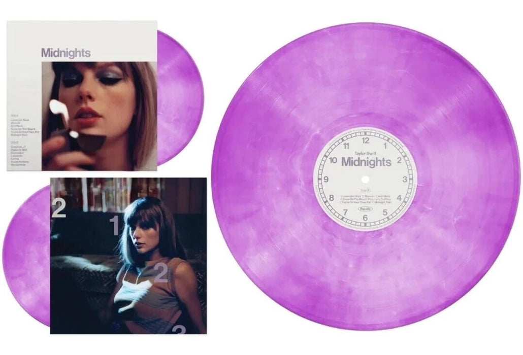 The album Midnights by Taylor Swift on Love Potion Purple Marbled Vinyl. This is an Exclusive Limited Edition Color Variant.