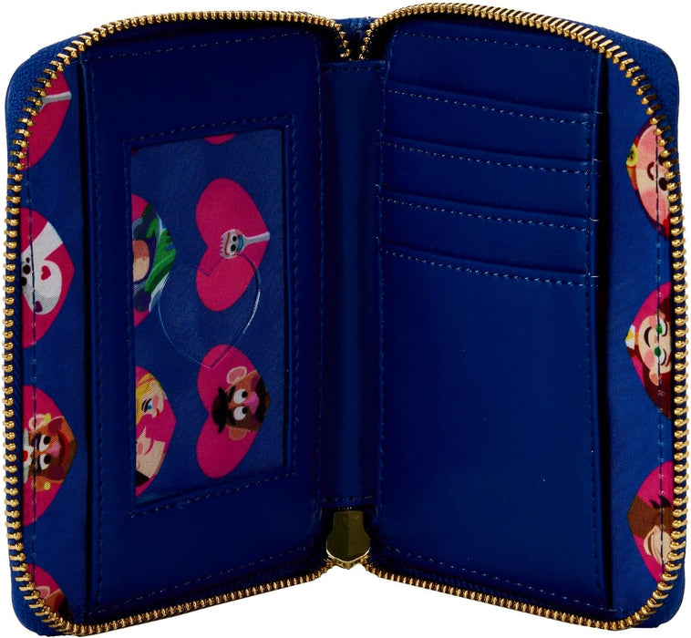 The wheels of fate are spinning in the amusement park, but Woody and Bo Peep manage to find each other. Celebrate this romantic encounter with the Toy Story Ferris Wheel Movie Moment Zip Around Wallet. On the front, Woody and Bo Peep gaze into each other’s eyes as they stand before the Ferris wheel, which sparkles at night. On the back, Slinky Dog, Hamm, Jessie, Buzz Lightyear, Rex, and Bullseye join Woody and Bo Peep in another appearance. Zip around wallet details include four slots for holding cards, one clear slot for holding your ID, billfold slots, shiny gold hardware, vegan leather (polyurethane), and embroidered and printed details. Note the coordinating lining. This wallet is an officially licensed Disney-Pixar product. Wallet dimensions: 5” W x 4” H (Please note: width is measured across the bottom of the wallet.)