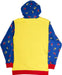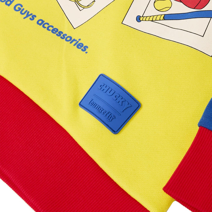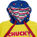 A BFFFF (Best Fiendishly Fashionable Friend Forever) is ready to play up your look. Our Chucky Hooded Jersey, which resembles a Good Guys Chucky doll box, is full of frighteningly fun details. On the bright yellow middle portion, letters in red spell out “Chucky,” and the text below reads, “He wants YOU for a best friend.” It also appears that he’s ready to come out of the box, as he “slashes” a “knife” with a metallic applique blade through the clear “plastic window,” which is really a clear gel print. You’ll also see that the Chucky “box” includes pictures of the Good Guys accessories and a message to collect them all. The sleeves, similar in color to Chucky’s denim overalls, feature a motif of Good Guys accessories, such as cowboy hats, baseballs, and more. Head off to a memorable play date or other adventures in style.