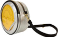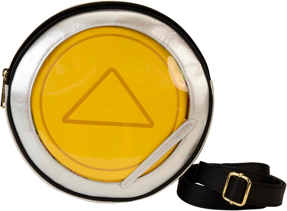 A winning look takes shape on this Squid Game crossbody bag. Relive iconic moments from the Netflix series with this accessory, which showcases the Dalgana challenge. This fully figural bag, in the circular shape of a candy tin, holds a reversible and detachable yellow coin bag. The coin bag displays the umbrella shape on one side, and a triangle on the other. Silver metallic faux leather adds extra sparkle, along with clear PVC material on the front. A die-cut applique of the cutting utensil for this game adds a realistic detail. Pack your daily essentials and take on any challenge in style.