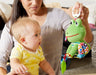 Jibber Jabber Jake baby toy is the perfect companion. Listen to him make froggy sounds as you turn him side to side. Baby can explore to find surprise crinkles and chew on the tethered leaf-shaped teether. Jake also has high contrast patterns and multiple bright colors, adding visual stimulation for baby as they play.
