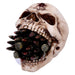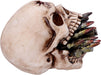 This skull rests with a large bullet wound in the front of his cranium. Tilting his head back and opening his mouth wide, a plethora of shells protrude from between his teat, clearly biting the bullet. Cast in the finest resin before being hand painted, this piece will be perfect to remind those to think before they speak.