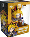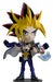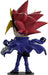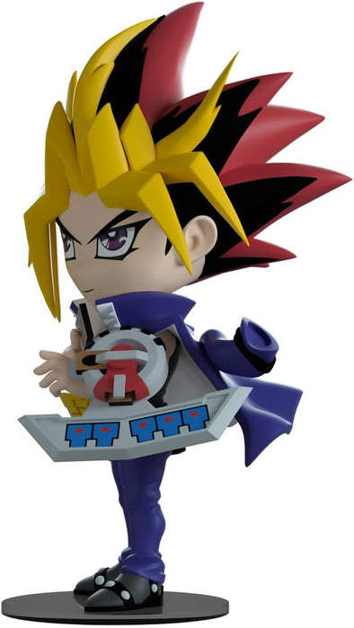 Yami Yugi defends his title as King of Games with his Youtooz debut At 4.8 inches tall, his black and maroon hair reaches up into chunky points while his iconic spiked fringe fans out in thick strands above his angular eyes and determined smile. With his trusty Dark Magician card held between the fingers of his right hand, he prepares to summon it with the grey and red duel disk attached to his left arm. The blue jacket draped over his shoulders blows out in wide ruffles and sits over the tight black singlet and blue pants he wears, while the Millennium Puzzle hangs around his neck by a thick silver chain. The exterior of his packaging sees Yugi preparing to play a card with Dark Magician and Dark Magician girl at his sides as Exodia looms ominously in the background. The interior is faded gold with strings of hieroglyphs that work their way onto his protective packaging, where he poses in front of a circular golden seal and his figure can be seen through the large clear window at its front.