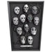 - DEATH EATER MASKS - 12 different masks belonging to the Death Eaters featured in the Harry Potter film series are recreated in miniature form and mounted on a wood display with a black finish and swirling details. The intricate details of each unique mask are captured in silver, black and green tones.