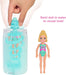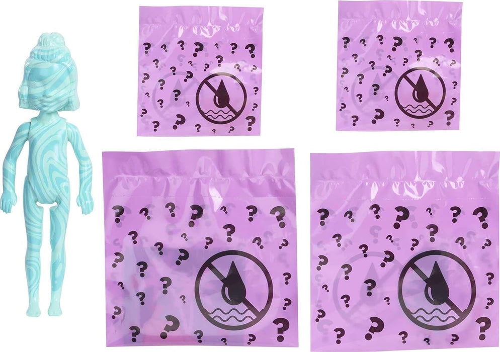 Barbie Color Reveal dolls deliver an unboxing experience full of surprises -six of them! A Chelsea doll wearing a colorful patterned swimsuit is guaranteed, but each doll's look remains a mystery until revealed. The packaging is part of the fun -pull the strip to remove the outer layer and reveal a clear tube. Inside is a mystery blue marble Chelsea Color Reveal doll and four bags hiding surprises inside. Remove them all and fill the tube with warm water, then insert the doll and swirl her around. The water turns pastel blue, and when the doll is pulled out, her features are revealed! Each doll has a different combination of eye color, molded hair, skin tone and decorated swimsuit, but the surprises continue…open the bags to discover a cover-up, pair of shoes, accessory and towel ready for fun in the sun! Color-change effects on the dolls' hair add to the surprise and fun. Each series has a unique theme -these Color Reveal dolls are all about sand and sun. Use the tube to store these and other favorites. Which doll will you reveal Kids can collect them to mix and match accessories and expand the possibilities! Each sold separately, subject to availability. Dolls cannot stand alone. Colors and decorations may vary.