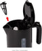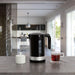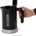 Füllmenge: bis zu 1,8 Liter Zentralkontakt 360° Cordless Verriegelter Sicherheitsklappdeckel mit Einhandbedienung Verdecktes Edelstahl-Heizelement Herausnehmbarer Kalkfilter Automatische und manuelle Abschaltung 2 außenliegende Wasserstandsanzeigen Überhitzungsschutz Beleuchteter Ein-/Ausschalter Basisstation mit Kabelaufwicklung Spannungsversorgung: 230 V, 50 Hz Leistungsaufnahme: 2200 W