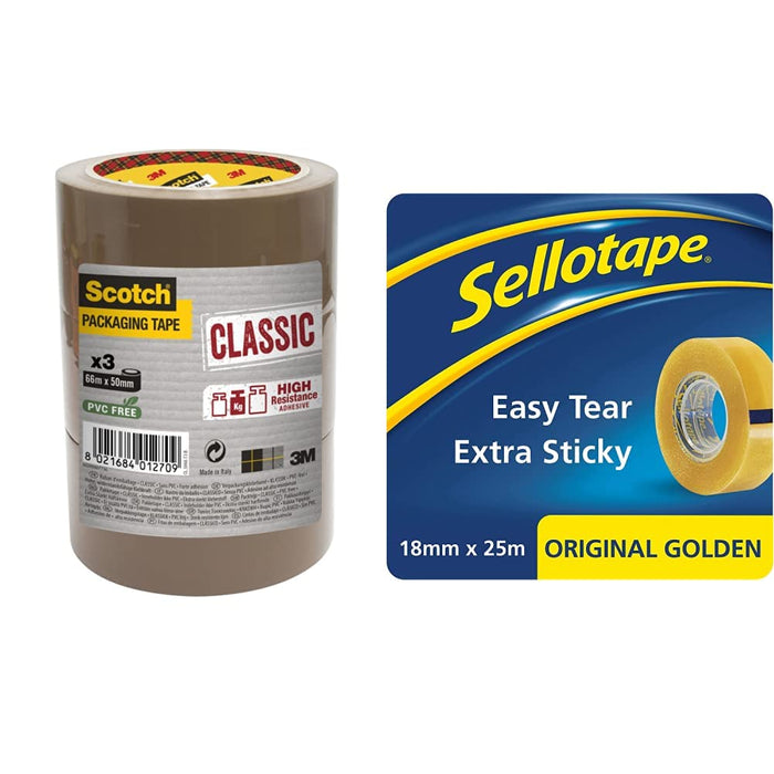 Scotch Packaging Tape Roll - Brown - 50 mm x 66 m Pack of 3 & Sellotape Original Golden, Multi-Purpose Clear Tape for Household Objects, Clear Packing Tape for Sticking Envelopes or Cards, 18mmx25m + ADHESIVE_TAPES,1443170
