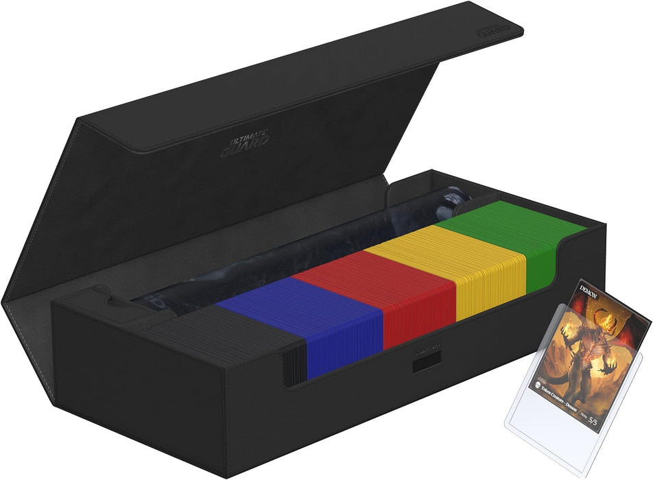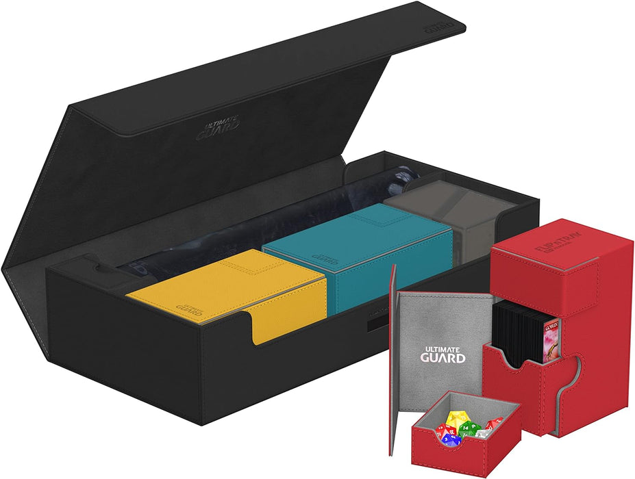 Our Superhive offers space for everything you will need during your gaming encounters. With compartments for multiple deck cases, two play-mats and accessories, the Superhive is offering you endless usages. Ideal in combination with our Sidewinders, you can place up to 550+ double-sleeved, 650+ single-sleeved cards or 1100+ unsleeved cards in standard size into the box.* The ZnapClaw, our inhouse-developed strong magnetic closure, keeps the Superhive closed at all times. Some examples of what it can hold: - 5x Sidewinder 80+ or 4x Sidewinder 100+ plus extra storage space - 5x Boulder 100+ or 6x Boulder 80+ or 7x Boulder 60+ or 11x Boulder 40+ - 550+ double-sleeved cards or 650+ single-sleeved cards or 1100+ unsleeved cards* - 2x Flip'n'Tray 80+ or 5x Flip Deck Case 80+ or 4x Flip Deck Case 100+ plus extra storage space - 230+ Top-Loaders (standard size, 12 mil) - 5x Deck Case 100+ or 6x Deck Case 80+ plus extra storage space - Designed for 550 double-sleeved or 650 single-sleeved standard sized cards in Ultimate Guard Sleeves* - Designed for two Play-Mats - Modular design for storing a variety of Ultimate Guard products - Convenient for carrying multiple decks - Easy access - Great for cubing - Resistant Xenoskin material - Monocolored design with quality microfiber inner lining - Strong magnetic closure with additional ZnapClaw locking mechanism * Designed for Ultimate Guard Sleeves. Sleeves from other brands may affect capacity/compatibility Dimensions approx. 406 x 199 x 90 mm Main compartment (inner dimension) approx. 400 x 70 x 80 mm Play-mat Tray (inner dimension) approx. 361 x 70 x 81 mm Dice Tray (inner dimension) approx. 70 x 80 x 33 mm