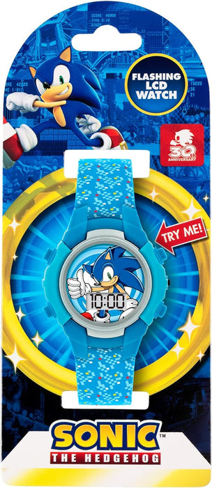 Sega Sonic the Hedgehog Flashing Watch. Featuring a light up case at the press of a button, a printed character dial, digital time display. Packaged on a branded backing card and comes with one year guarantee.