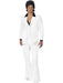 Adult mens size 70s disco dude white suit fancy dress costume includes a pair of white flared trousers long sleeved white jacket with mock shirt and waistcoat.