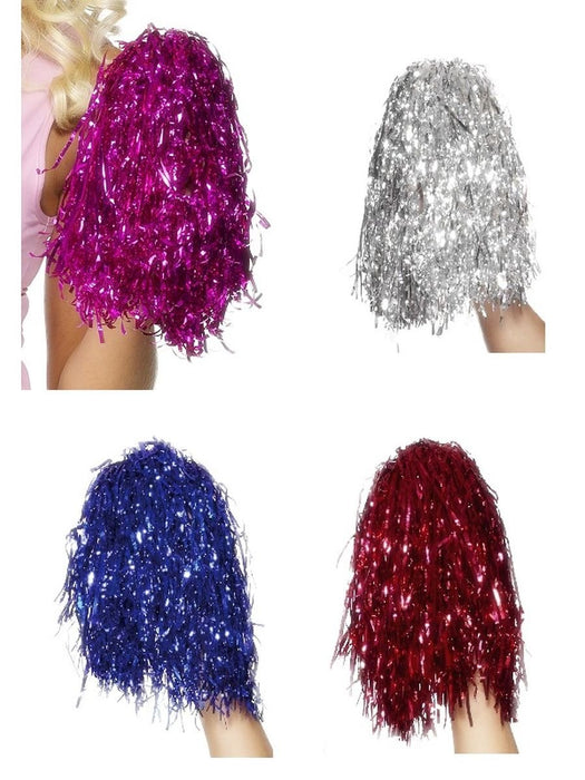 Join the cheerleading squad with these metallic blue pom poms. There are two in the set. Stand out from the crowd at your next party. Available on the website.