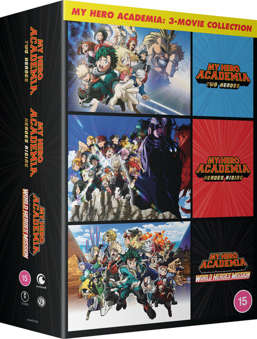 Feature-length anime triple bill based on the manga by Kohei Horikoshi and set in a world where the majority of the population possess superpowers known as Quirks. In 'Two Heroes' (2018), student Izuku Midoriya (voice of Daiki Yamashita) dreams of one day becoming a hero despite the fact he doesn't have a Quirk. Determined to achieve his goals, Izuku attends The Hero Academy and soon catches the eye of renowned hero All Might (Kena Miyake) who agrees to train him. When All Might is invited on a trip to I-Island where they conduct experiments on Quirks, he asks Izuku to accompany him, but he must promise not to divulge details of their shared Quirk that they call One For All. In 'Heroes Rising' (2019), Izuku and former enemy Katsuki Bakugo (Nobuhiko Okamoto) now fight on the same side to defend themselves against their biggest ever threat, the villain Nine (Yoshio Inoue). Finally in 'World Heroes Mission' (2021), a cult known as Humarise fears that Quirks will become so powerful that humanity will face extinction. Because of this they have planted bombs all over the world filled with a toxin that causes people's Quirks to spiral out of control, which leads to their deaths. When the first bomb detonates, Izuku, Katsuki Bakugo and Shoto Todoroki (Yuki Kaji) are sent to investigate but when Humarise frame Izuku for murder, he must go into hiding. Can they locate and disarm the remaining bombs before it's too late?