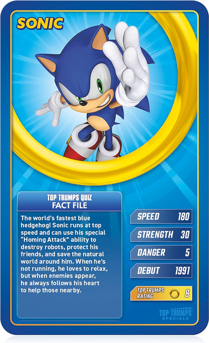 The Blue Blur himself has hurtled through Top Trumps HQ and whipped up a brand new edition of Top Trumps Specials! Relive Sonic's greatest adventures, retro and contemporary, with this pack celebrating thirty of Sonic's allies and enemies from throughout gaming history. Since his debut in 1991, Sonic has encountered a huge variety of friends and foes, from Metal Sonic, Silver and Chaos to Blaze, Cream and Big. Now you can reminisce and battle it out to discover who's the Top Trump in the world of Sonic the Hedgehog. With categories including Speed, Strength, Danger and Debut, every character has a chance to win. Whether you grew up with Sonic's original adventure on the Sega MegaDrive, or you prefer the fast-paced action of his newer adventures, this pack recaps some of the biggest moments in gaming history, from Green Hill Zone to Eggman's Interstellar Amusement Park, and is sure to thrill experienced players and newbies alike! Will Team Chaotix's own Espio win the day with his Speed stat, or will the adorable Chao's Debut secure your victory? Just watch out for Eggman's Danger stat!