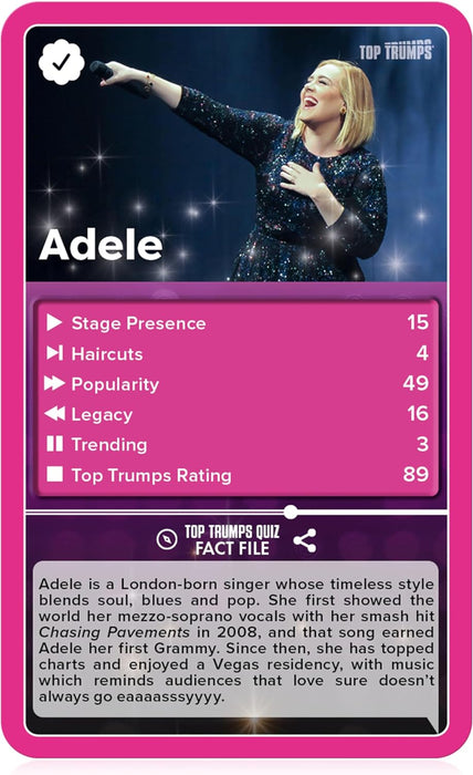 Calling all pop music lovers! Top Trumps is pleased to announce this special edition of the classic card game. Here you'll find all your favourite musicians, such as the one and only Taylor Swift, heartthrob Harry Styles, and the timeless Elton John! With categories including Stage Presence, Legacy and Haircuts, as well as how high an artist is Trending, compete with friends and compare stats to claim every card and become the winner! Will you win big with Rihanna's popularity or will Billie Eilish's stage presence grant you victory? Listen to your favourite jams and find out with this Pop Stars edition of Top Trumps!
