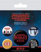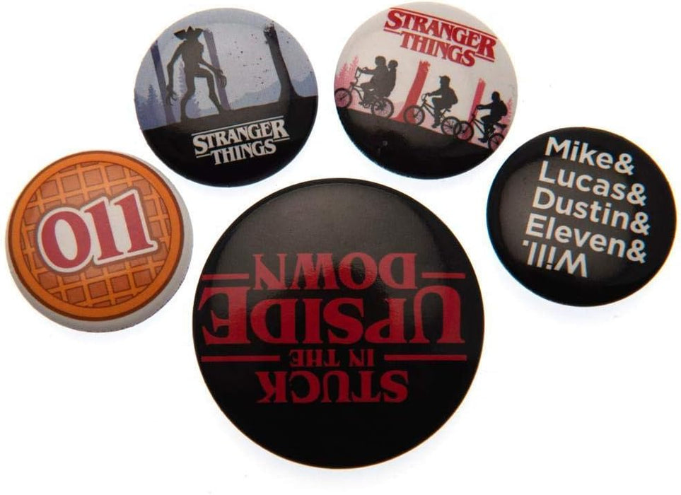 - GIFT PACK OF 5 STRANGER THINGS BADGES - with a pin at the back, to wear on a jacket, scarf or jumper, attach to the strap of a satchel or fix on to a sports bag