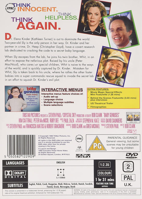 Dr Elena Kinder (Kathleen Turner) and Dr Heep (Christopher Lloyd) have designs on world domination, and intend to achieve it by cracking the code of a secret baby language. One of their unwilling guinea pigs, two-year-old Sly, escapes and enlists the help of his twin brother Whit to thwart the duo's evil plans.