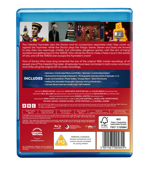 The Celestial Toymaker sees the Doctor and his companions separated when they come up against the Toymaker. While the Doctor plays the Trilogic Game, Steven and Dodo are forced to play their own seemingly childish, but ultimately dangerous games, with the aim of being reunited and getting back to the TARDIS. Who will be the first to make a false move in this battle of wits, and will the TARDIS ever escape the Toymaker's snare? Fans of Doctor Who have long lamented the loss of the original 1966 master recordings of all except one of The Celestial Toymaker. All episodes have been animated in both colour and black and white using the original off-air audio recordings.