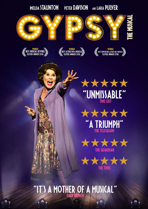 Imelda Staunton stars in "the performance of her career" in one of the greatest ever musicals, based on Gypsy Rose Lee's Memoirs, the famous striptease artist. Telling the story of the original archetypal show-business mother, who raises Lee (played by Lara Pulver - True Blood, Sherlock) and her sister June as they travel around America with their vaudeville act and co-stars Peter Davison (Dr Who, All Creatures Great and Small).