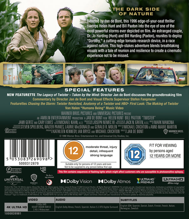 Special Features: New: The Legacy of Twister: Taken By The Wind. Plus Feature Commentary by Director Jan De Bont, The Making of Twister, Anatomy of a Twister, Chasing the Storm: Twister Revisited - TBC