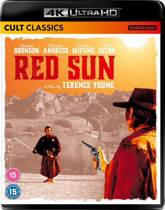 Billed as the first East meets West Western, and directed by Terence Young, RED SUN is based on a true story from the American Wild West of 1870. When outlaw Link (Charles Bronson) is betrayed by his gang during a train robbery, he is forced by the Japanese Ambassador to help regain a priceless sword stolen by Link's double-crossing partner Gauche (Alain Delon). Link and the Ambassador's bodyguard, Kuroda (Toshiro Mifune), travel the West in pursuit of Gauche, attempting to lure him out by taking his girlfriend (Ursula Andress) as hostage. Although Kuroda plans to kill Gauche straight away, Link needs him alive to find the loot from their last robbery. Joined in an uneasy alliance, they have only seven days to find Gauche or Kuroda must follow his samurai code of honour and die by his own sword.