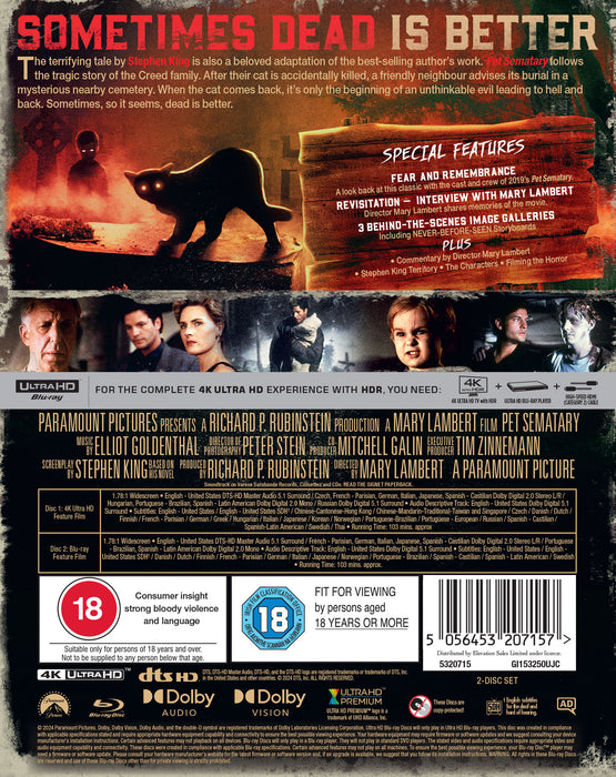 Special Features: Behind the Scenes, Bonus Footage, Commentary: Mary Lambert, Documentaries: 'Fear and Remembrance'; 'Stephen King Territory'; 'The Characters'; 'Filming the Horror', Image Gallery, Interviews: Mary Lambert (director), Original theatrical poster; 6 art cards; 'Pet Sematary' collectible board; 2 stickers