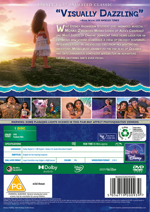 Walt Disney Animation Studios' Epic animated musical Moana 2 re-unites Moana and Maui three years later for an expansive new voyage alongside a crew of unlikely seafarers. After receiving an unexpected call from her wayfinding ancestors, Moana must journey to the far seas of Oceania and into dangerous, long-lost wtaers for an adventure unlike anything she's ever faced.