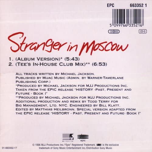 Michael Jackson – Stranger In Moscow Label: Epic – EPC 663352 1 Format: CD, Single, Card-picture-sleeve Country: Europe Released: 1996 Genre: Electronic, Pop Style: House, Downtempo Tracklist Hide Credits▼ 1 Stranger In Moscow (Album Version) 5:43 2 Stranger In Moscow (Tee's In-House Club Mix) Edited By – Matthias Heilbronn Engineer – Bill Klatt Producer [Additional], Remix – Todd Terry 6:53 Credits▼ Written-By, Producer – Michael Jackson Notes▼ Track 1 - Taken From The EPIC Release "HIStory - Past, Present And Future - Book 1" Track 2 - Adapted From The EPIC Release "HIStory - Past, Present And Future - Book 1" Barcode and Other Identifiers▼ Barcode: 5099766335216