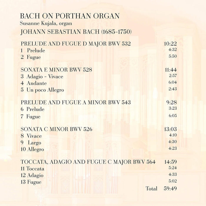 The Finland based German organist Susanne Kujala has gained the reputation to be one of Finlands most outstanding organists. Contemporary music is an essential part of her work: she has premiered over 50 works and two, soon three concertos. Like contemporary music sometimes does, the organ works of J. S. Bach felt very modern to the people of his time. Bachs works are still fresh and inspiring as the program of this album proves. Bach on Porthan Organ continues Susanne Kujalas series of introducing Finlands organs to a larger audience. Her debut release Organ Triptychon was recorded on three significant instruments of Helsinki. This new album features the Porthan Organ of St. Lawrence Church in Janakkala. The series is to be continued with her upcoming release Finnish Organ Music of the 21th Century, which has been recorded already on the organs of Turku Cathedral, Helsinki Kallio and St. Pauls Church. Organ builder Martti Porthan made the organ building style of the German Baroque alive in Finland. All main features of the Porthan organ of St. Lawrence in Janakkala are based on the famous Hu Schnitger organ of Ss. Cosmae et Damiani in Stade. This album is the 25th anniversary recording of the Porthan organ, which was built in 1993.