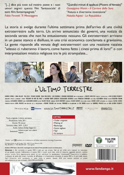 Italy released, PAL/Region 2 DVD: it WILL NOT play on standard US DVD player. You need multi-region PAL/NTSC DVD player to view it in USA/Canada: LANGUAGES: Italian ( Dolby Digital 5.1 ), English ( Subtitles ), Italian ( Subtitles ), WIDESCREEN (2.35:1), SPECIAL FEATURES: Behind the scenes, Interactive Menu, Making Of, Scene Access, Trailer(s), SYNOPSIS: Aliens land on Earth to find a nation which is tired and disillusioned, steeped in economic crisis. The reaction caused by the arrival of these extra-terrestrials ranges from racism to bizarre mystic-religious interpretations. The film focuses on a particular character: Luca Bertacci, a man with huge relational problems. The presence of the extra-terrestrials changes everything. By the end of the film it's almost impossible not to believe that they came to Earth just for him. SCREENED/AWARDED AT: Venice Film Festival, .The Last Man On Earth ( L'ultimo terrestre )