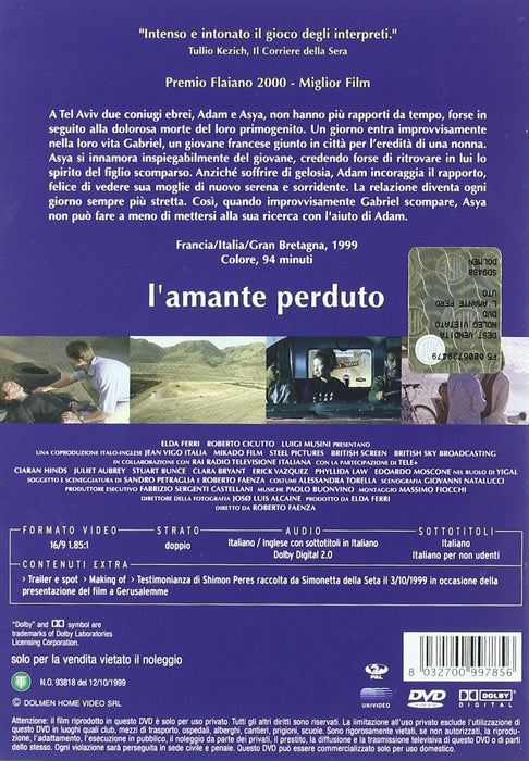 Italy released, PAL/Region 2 DVD: it WILL NOT play on standard US DVD player. You need multi-region PAL/NTSC DVD player to view it in USA/Canada: LANGUAGES: Italian ( Dolby Digital 5.1 ), English ( Subtitles ), Italian ( Subtitles ), WIDESCREEN (1.85:1), SPECIAL FEATURES: Interactive Menu, Making Of, Scene Access, Trailer(s), SYNOPSIS: Italian director Roberto Faenza creates this complex psychological drama about love and tragedy in the cultural minefield of the Middle East. Thirteen years ago, Asya (Juliet Aubrey) and Adam (Ciaran Hinds) witnessed the violent death of their three-year old son in London. Though the couple eventually moved to Tel Aviv, Asya never fully recovered from the misfortune, growing emotionally distanced from her husband and teenaged daughter Dafi (Clara Bryant). When young Frenchman Gabriel (Stuart Bunce) appears, however, Asya comes to believe that the youth is her dead child. Though Adam is simply happy that his wife is laughing again, the bond between Gabriel and Asya soon starts to navigate that disquieting gray area between parental love and carnal passion. Then, just as suddenly as he appears, he mysteriously disappears in his grandmother's old Morris, driving the utterly distraught Asya to search the ends of Israel for him. Meanwhile, Dafi falls for gentle Palestinian mechanic Na'im (Erick Vazquez), though their young love is tested by cultural misunderstandings and prejudice.Lost Lover ( L' Amante perduto )