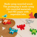 Inside the box, you’ll find 24 wooden acrobats, a wooden die, and English, Dutch, French, German, Italian, and Spanish instructions, all made using FSC materials. Animal Acrobats from Petit Collage is a plastic-free product. The animal pieces are 100% recycled wood, and the box is made using 75% recycled materials.
