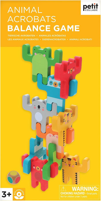 - THOUGHTFULLY DESIGNED – Inside the box, you’ll find 24 wooden acrobats, a wooden die, and English, Dutch, French, German, Italian, and Spanish instructions, all made using FSC materials. Animal Acrobats from Petit Collage is a plastic-free product. The animal pieces are 100% recycled wood, and the box is made using 75% recycled materials.
